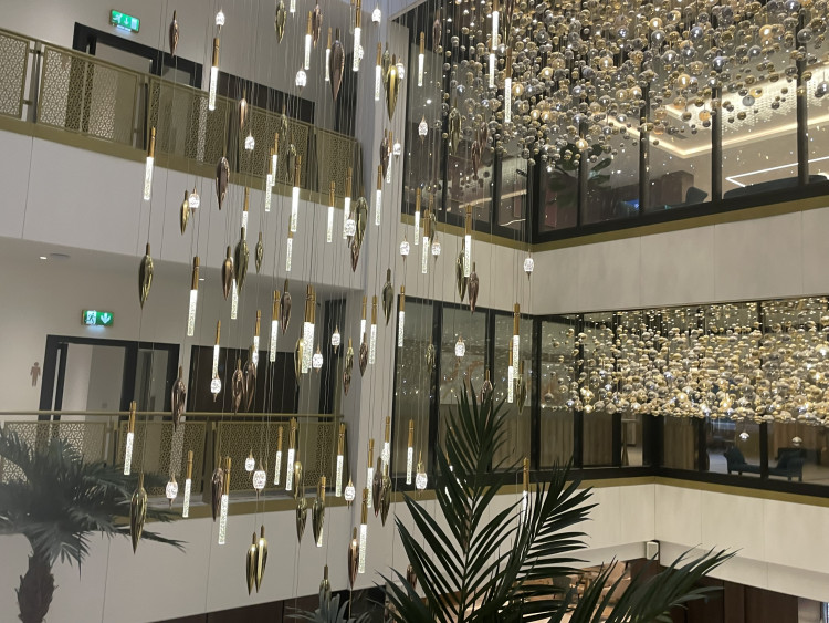The first impression on entry is nothing short of awe-inspiring. A grand entrance at the mouth of the pyramid leads visitors along a red carpet into a spacious foyer, where an elegant light display cascades from the peak of the pyramid right down to its base. The visitor's eye is drawn up and down the extent of the building, taking in all its grandiosity.