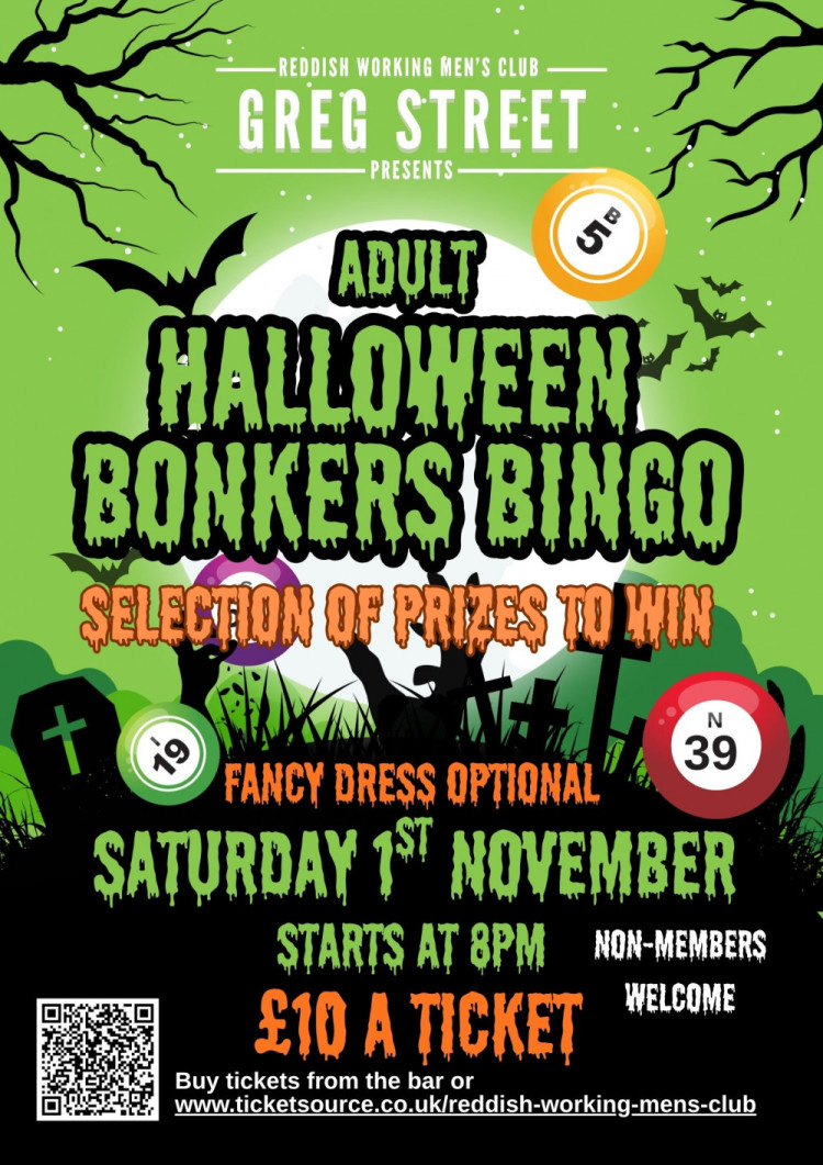 Buy your tickets from: https://www.ticketsource.co.uk/reddish-working-mens-club/halloween-bonkers-bingo/e-xobaae